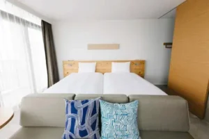 객실은 일본식 다다미와 서양식 베드를 혼합한 와양실(和洋室) 타입이 주력이며, 창 너머로 다케오의 산 풍경이 시야를 가득 채웁니다. 도시 호텔의 창문 너머에서 마주하게 되는 빌딩 숲이나 주차장의 삭막한 풍경과는 차원이 다른, 계절마다 색채를 바꿔가며 살아 숨 쉬는 자연의 캔버스가 매일 아침 커튼을 열 때마다 투숙객을 맞이합니다. 특히 초가을 단풍이 산기슭을 타고 번져가는 시기와 이른 봄 벚꽃이 점처럼 피어오르는 풍경은, 이 숙소를 선택한 투숙객만이 누릴 수 있는 시각적 보상입니다.